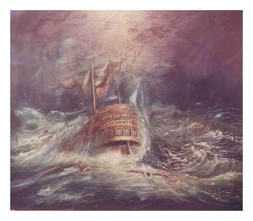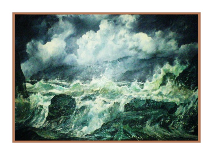This first photograph of an A.J.Godden original oil painting of a Sailing Ship in Rough Sea's off Cape Horn shows Alec's artistic imagination and mastery with a brush on canvas. The second picture is an oil painting of a rough turbulent sea crashing to the rocky shore. |
