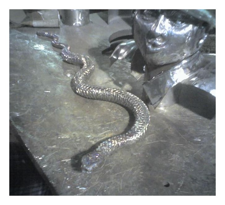 Stainless steel is the medium of choice although deadly to weld and work with and rather expensive material, this welded sculptured snake and bust of an Irish whister will never age and tarnish or depreciate artistically in value. |